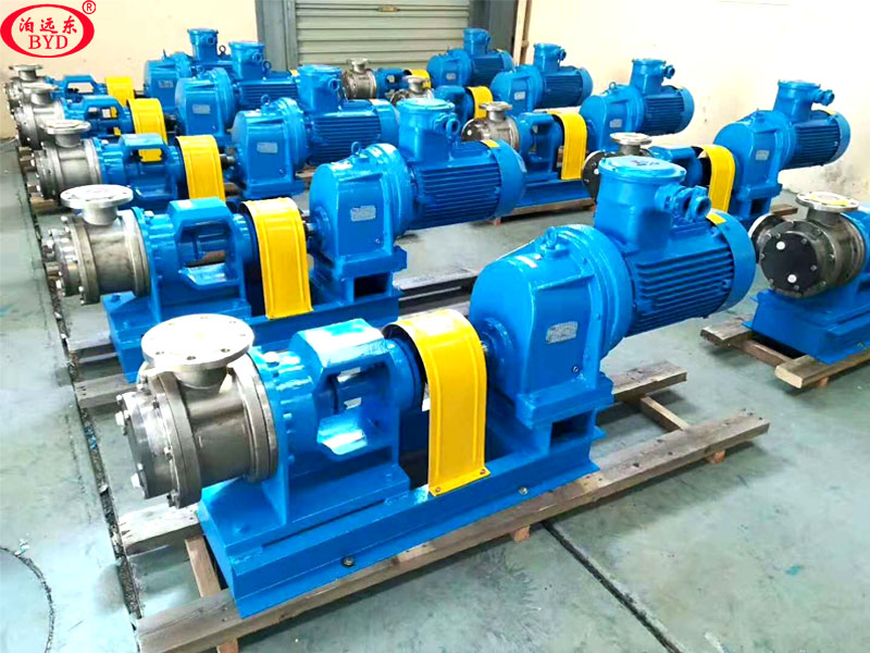 泵主要由內外轉子、軸、泵體、前蓋、托架、密封、軸承等組成。密封有機械密封和填料密封兩種形式,對于高溫、高粘稠度及腐蝕性較強的介質,選用填料密封(特殊要求,可選用磁力驅動,零泄漏結構)。輸送易結晶物料時,在前蓋和泵體上可設計帶有保溫夾套,工作時通蒸汽保溫融化。泵可配閥,當泵或管路系統超壓時,閥打開,形成內部回流,保證系統。泵裝置由泵、電機和底座組成。傳動方式有橋式和直聯式兩種。從電機端向泵看,為順時針旋轉,右進上出。與物料接觸的過流部件,常用材料如下:HT200、WCB、不銹鋼304、304L、316、316L、904、904L。