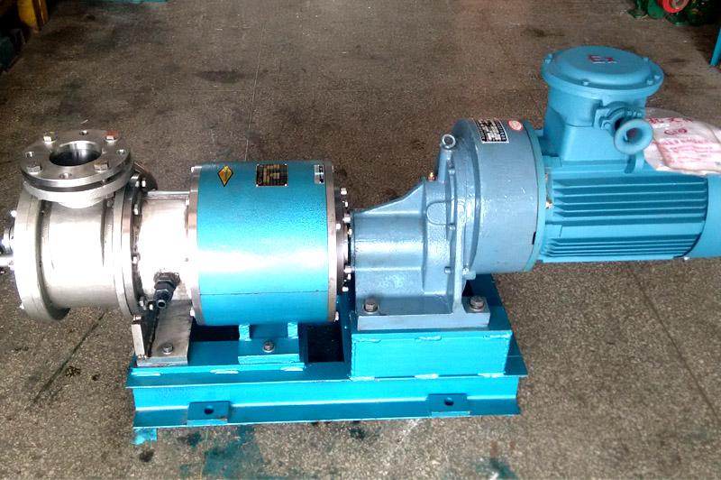磁力齒輪泵主要由齒輪泵頭、磁力傳動器、電動機、連接底板等幾部分零件組成。磁力傳動器由外磁轉子、內磁轉子和不導磁的隔離套組成;當電動機帶動外磁轉子旋轉時,磁場能穿透空氣隙和非磁性物質,帶動與主動齒輪相連的內磁轉子作同步旋轉,實現動力的無接觸同步傳遞,將容易泄露的動密封結構轉化為零泄漏的靜密封結構。由于泵軸、內磁轉子被泵體、隔離套完全封閉,從而徹底解決了“跑、冒、滴、漏”問題,了石油化工等行業易燃、易爆、有毒、有害介質通過泵密封泄漏的隱患。